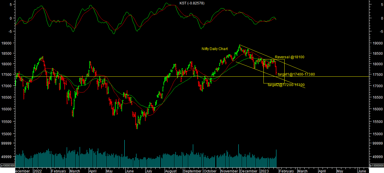 Momentum indicators Daily KST & Daily MACD both are in SELL supporting short term trend. Break of medium term reversal levels will lead to further sharp sell off towards 17100/17200 levels on nifty & 57500 levels on sensex in short term. Investor should use any kind of correction or consolidation to buy stock specific in tranches in disciplined manner from medium to long term perspectives till it reveses.